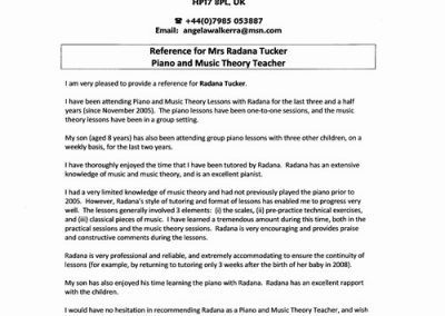 I have received piano lessons from Radana Tucker for about 5 years. She is clearly an accomplished pianist, capable of teaching at a high level, certainly well beyond my standard. More importantly, as an adult learner I have needed a teacher such as Radana with great patience – since technique, timing and rhythm do not come easily to me. Radana has been an excellent piano teacher and I wholeheartedly recommend her to students of all ages.